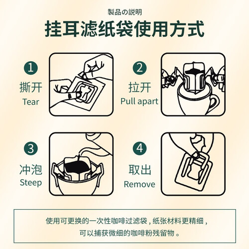 挂耳部分采用加厚的设计,无论怎么抻拉都不会断裂损坏,适合各种规格的杯具使用。甄选日本进口的无纺布制成,过滤干净无残渣。