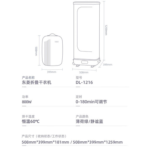 安装方便简单,可折叠收纳不占地。即开即热,快速干衣,立体循环风力,除螨去味,恒温烘干,保持衣物柔软不回潮,智能断电。