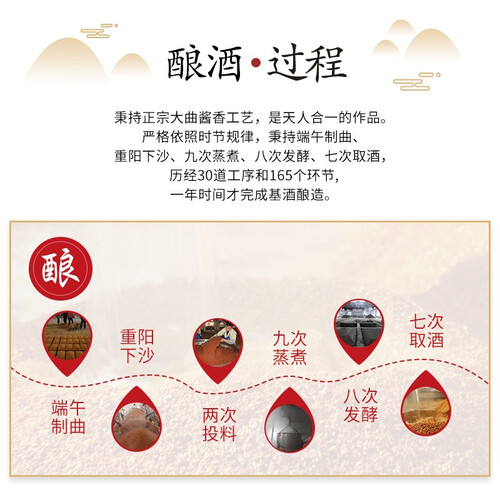 源自酱酒核心产区茅台镇,优粮好水酿美酒,5年陶藏,滴滴珍贵,颇具收藏价值。坚持手工制曲,全粮固态发酵,深受酒友喜爱。
