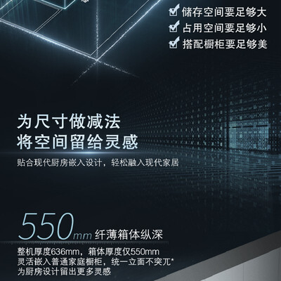 机身采用纤薄设计,占地面积小,满足嵌入式安装需求。智能双变频设计,实时感知温度并调节制冷量,减少温度波动。