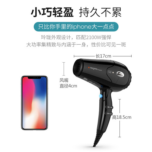 2100W大功率劲风设计,只需几分钟即可快速干发,助力现代快节奏生活。千万级浓度负离子温柔呵护,以达到更好的发丝护理。