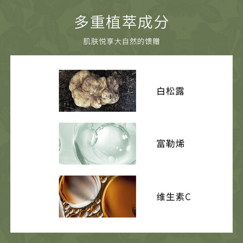 法国白松露精粹,有效解决肤色暗沉与面部细纹等困扰,肌肤状态更健康。日本富勒烯成分,使得肌肤肤色更显均匀通透。