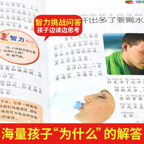 这套朝旭文化编《十万个为什么》书里内容有拼音解注,字体也蛮大的,还配有一些图画,印刷清晰,孩子翻着看也很方便。