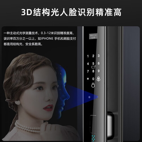 3D结构光人脸识别技术,识别准确率和安全系数更高,告别传统钥匙解锁的麻烦,让您站在门前就能识别解锁。