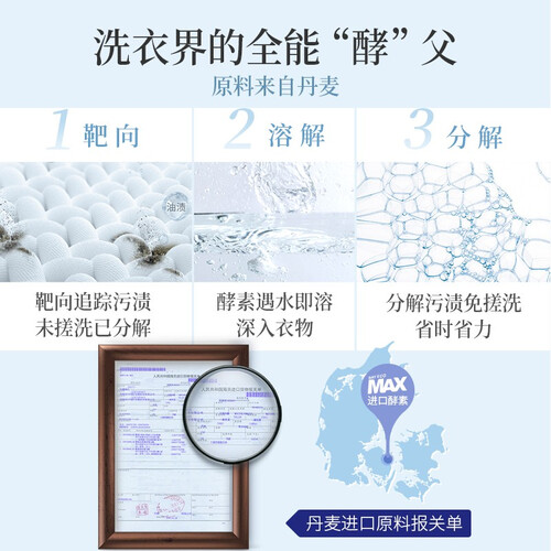 无荧光剂和增白剂配方,洗涤后在衣服上无残留,可降解的配方,物质具有一定的水溶性,大大降低排放时的生态压力。