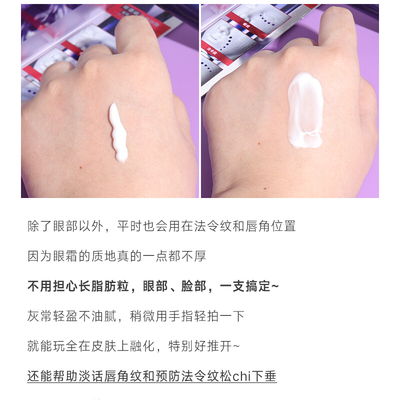 质地轻盈水润,锁住肌肤水分,防止流失,温和亲肤不刺激,有效淡化法令纹,改善黑眼圈。
