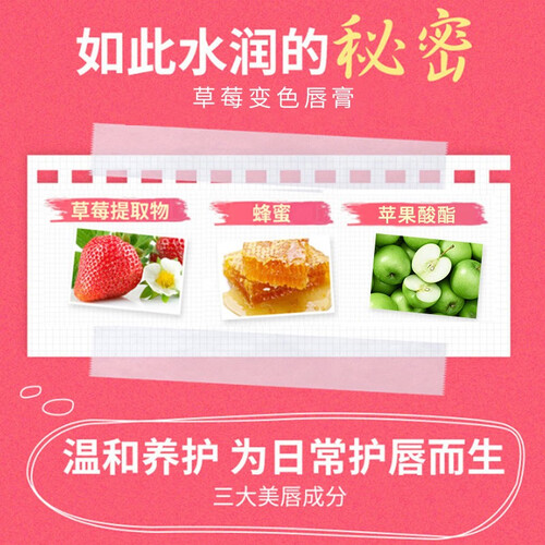 可食用配方,安全健康无添加,即使是学生也可放心使用。草莓提取物、白池花及苹果酸酯三大美唇成分,性感美唇就此拥有。