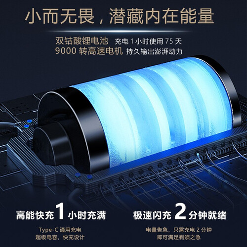 德国进口刀片,自研磨工艺刀片更锋利,实现快速断须,节省剃须时间。双钴酸锂电池,超长续航,出差旅游携带无忧。