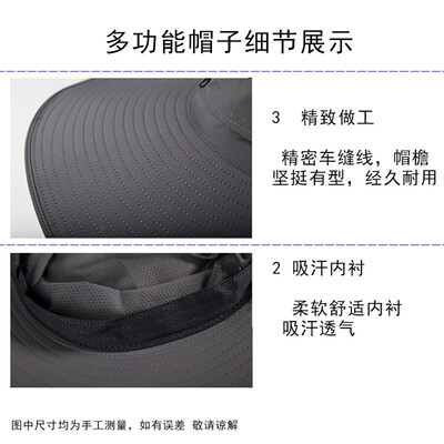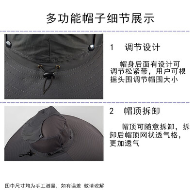大帽檐设计,遮阳面积更大,提高防晒效果,呵护你的肌肤健康;帽顶可拆卸,透气性好,时刻保持头部干爽。