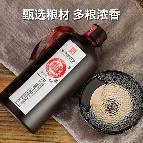 延续固态发酵的酿制工艺,呈现出稠润的优质老酒,线条如丝般连绵不断。酒线落入杯中,形成绵密酒花,久久不破。