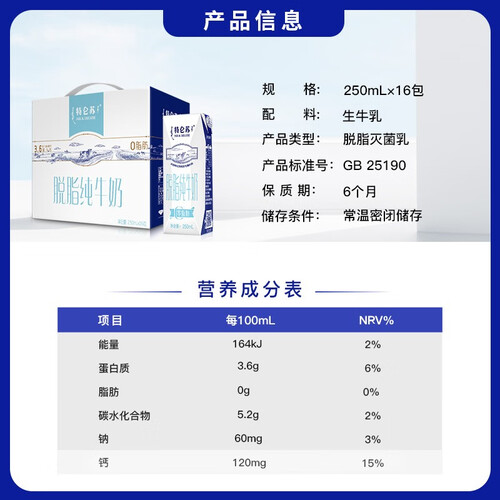 特仑苏 利乐钻脱脂纯牛奶