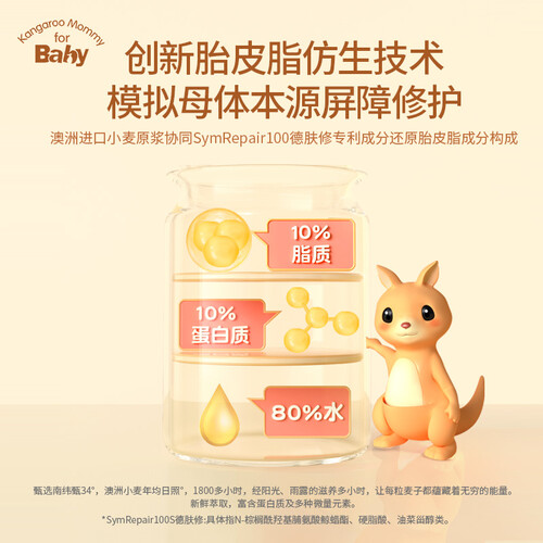 3大植萃,强健皮脂,澳洲进口小麦原浆,植物舒缓成分,科学筑建幼肌修护屏障,创新胎皮质仿生技术,解除干燥警报。