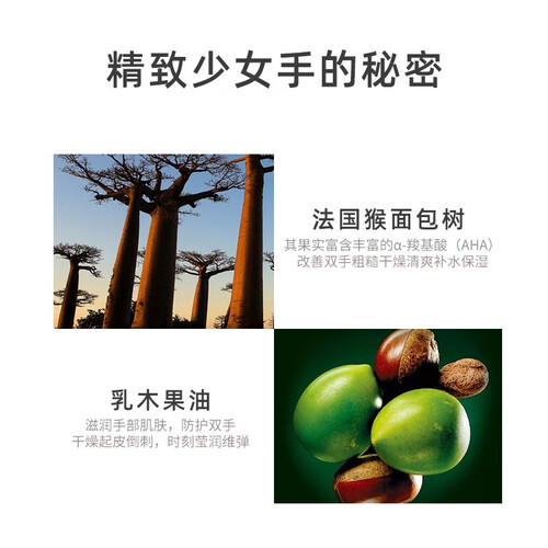 蕴含法国猴面包树,能够改善双手粗糙干燥,清爽补水保湿。协同乳木果油,滋润手部肌肤,防护双手干燥起皮倒刺。