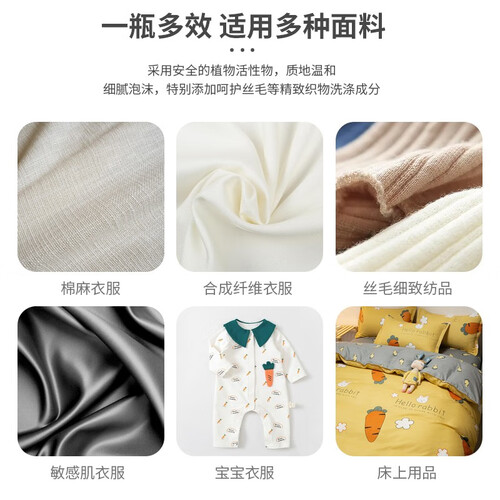 添加椰子油皂基,专为娇贵衣物配制,对衣物纤维无损伤,护色亮衣。低泡沫易漂洗,省水洁净,无残留更健康。