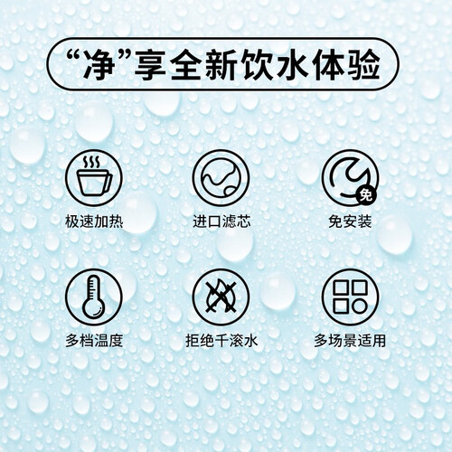 机身小巧紧凑,无须占用太大空间,满足随时随地的用水需求。即滤即热,避免千滚水,避免水质矿物质的流失。