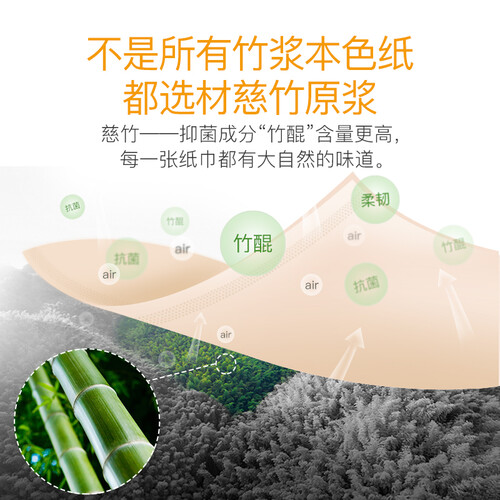 甄选优质原生竹浆,无化学成分,不漂白,保留原色,使用更健康放心。竹纤维拥有立体吸水孔,能迅速吸水,更加干爽洁净。