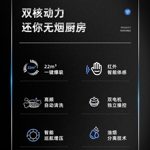 采用环形设计可以提升吸烟效果,一次吸尽爆炒油烟,不存在跑漏烟问题。兼具必要的增压功能,全面防止油烟倒灌。