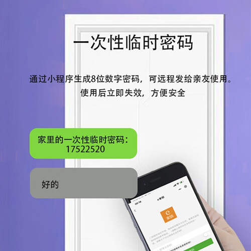有指纹解锁、密码解锁、钥匙解锁、临时密码、组合解锁等多种解锁方式,满足不同需求。通过小程序可生成临时密码,用后立即失效。