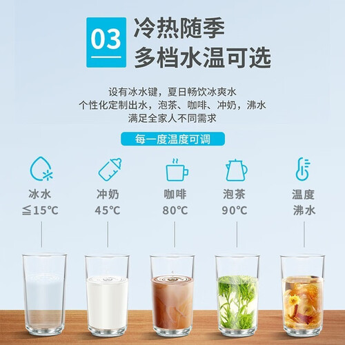 冷热两用,不仅可以喝热水,还能喝到冰爽冷水,四季适用。机身设置一颗冰水键,快速定制出水,满足不同喝水需要。