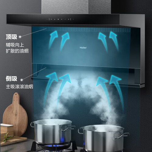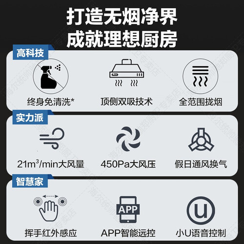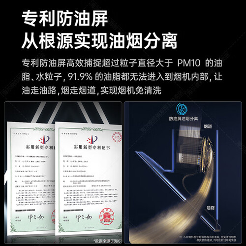 专利防油屏科技的烟机,油烟分离,腔体洁净吸力不衰减。顶侧双吸设计,四面立体包裹油烟,不外溢、不扩散。