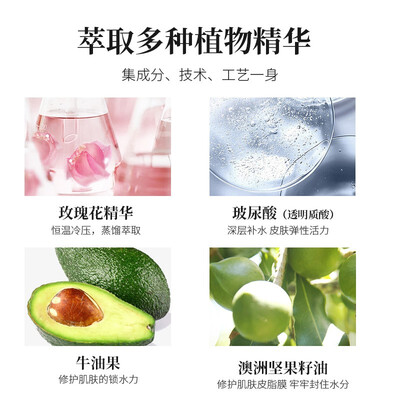 蕴含的玫瑰精华,可以水润透亮肌肤,改善粗糙的沙漠皮,而玻尿酸的成分,可以加乘水分的吸收,保持肌肤持久水润。