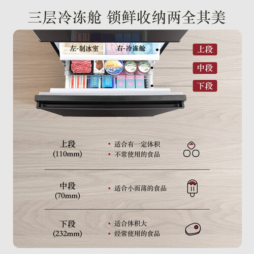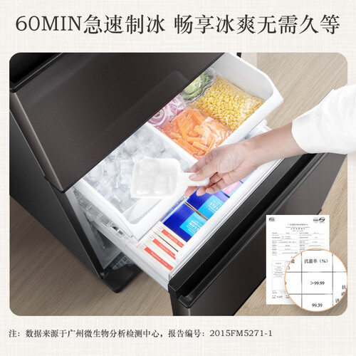内置60min急速出冰设计,一键就能享受冰爽畅饮;搭载无霜冷冻科技,食材更加新鲜,轻松做出星级料理。