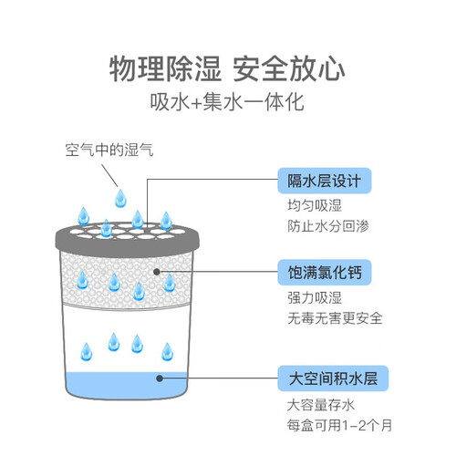 优选大颗粒氯化钙,饱满的颗粒提升了吸湿的效果,更加耐用。一盒可吸湿450ml,效果持久,免去你的后顾之忧。
