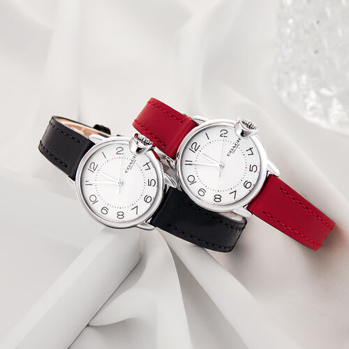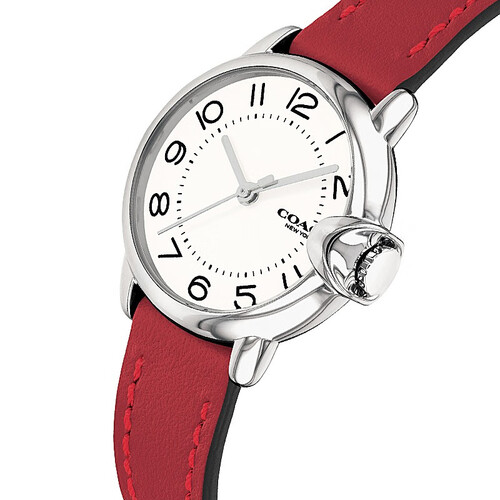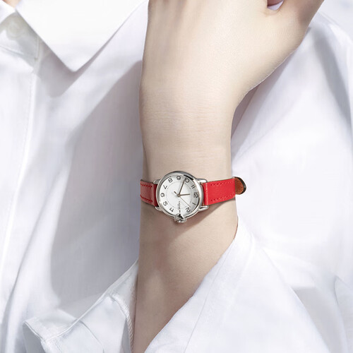 罗马数字刻度简约大方,红色皮质表带,白色圆形表盘。