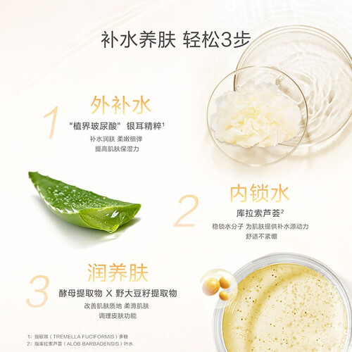 富含雪耳精粹,充盈肌肤保湿力,它有着植物界玻尿酸的美誉,分子小于玻尿酸分子,可以直接渗透进肌底,让肌肤细胞间饱满起来。