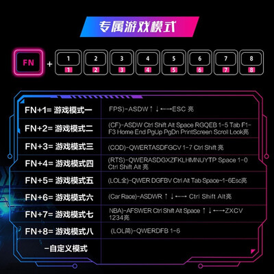 按键灯光采用马卡龙色调特别校色,通过Fn键随意切换灯效,容易操作。深度优化高特机械轴,点击频率高,使用寿命长久。
