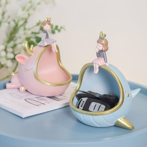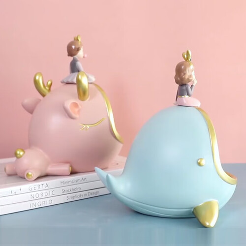 整体颜色为蓝色,造型以少女和鲸鱼为主,造型别致温暖;含有收纳和装饰的功能,方便储存物品,方便整洁桌面。