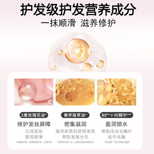 富含多种矿物质成分,能够多方位修护受损发质,补水锁水,维持发丝水分,三重玫瑰精油,一抹顺滑,修护发丝屏障。