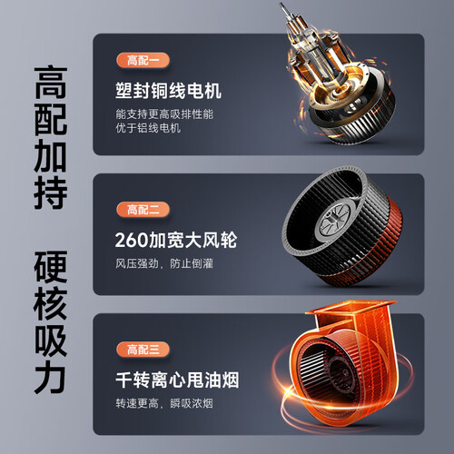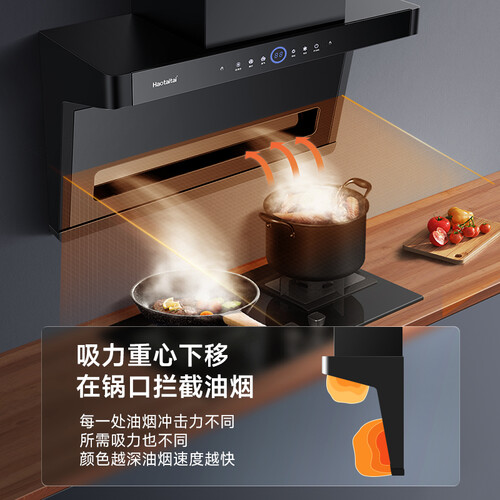 采用下置直吸模式,可较大限度靠近烟源,效果更佳。拥有巡航增压功能,加大排烟力度,排烟无阻碍,更加通顺流畅。