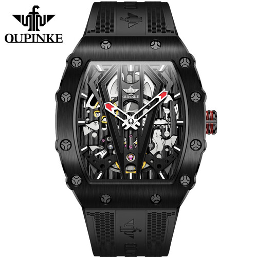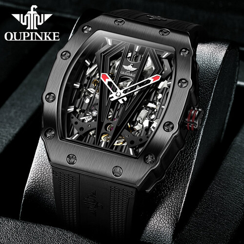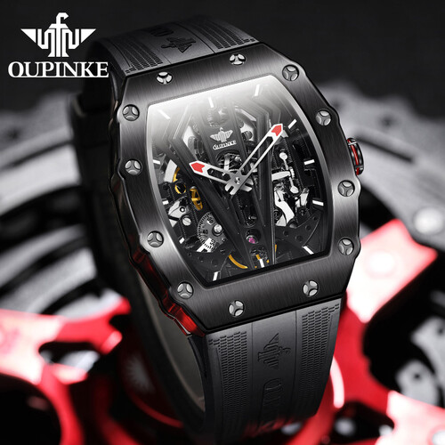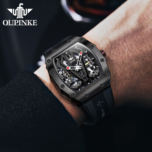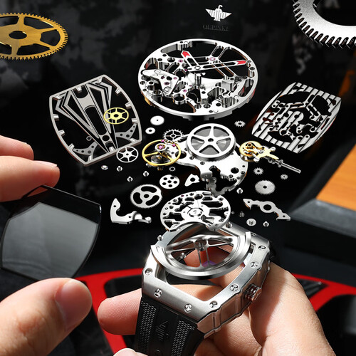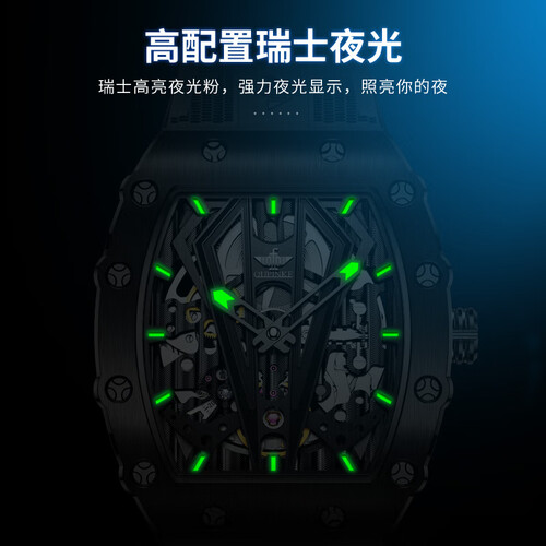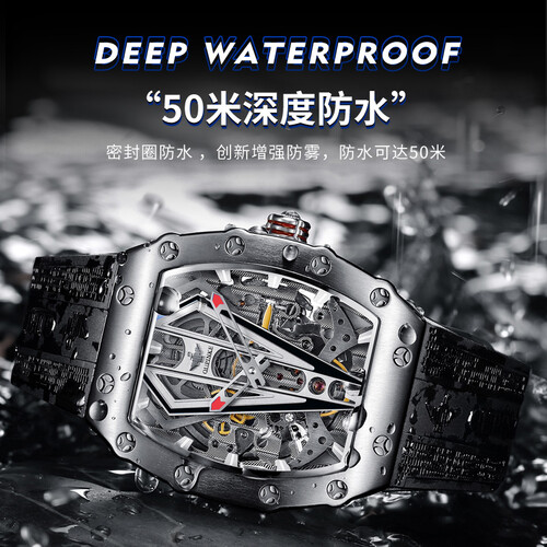 别致的酒桶形外观,配合全金属材质打造而成的表盘。以及融合镂空的处理之后,让表内机械的运作一眼可见,增强科技风范。