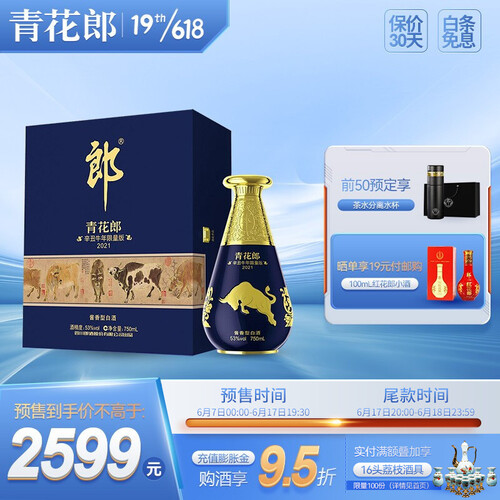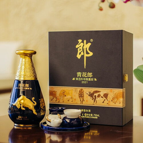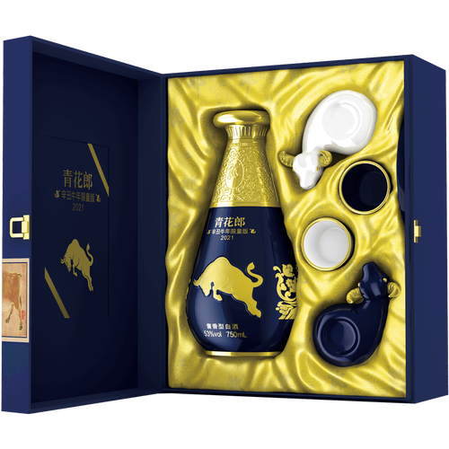 瓶身选用浮雕金牛搭配水花瓶盖,传递勤劳友好、事业兴旺之意。青花郎空杯留香持久,空杯闻香,具有收藏价值。