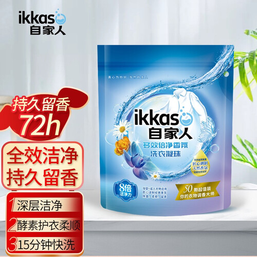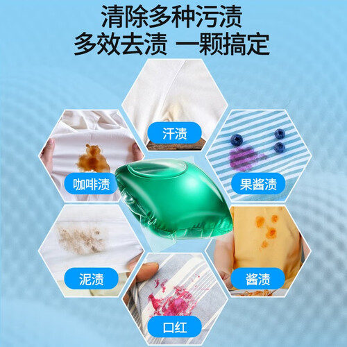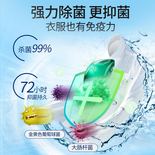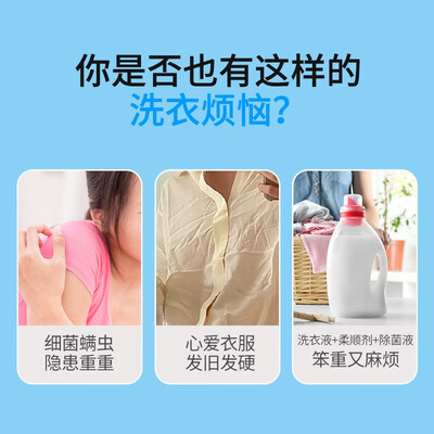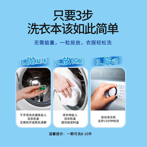 采用进口水溶膜,遇水快速溶解,15分钟快速洗衣,衣物上无残留。添加了柔顺剂成分,洗衣后衣物柔顺亲肤,远离静电。