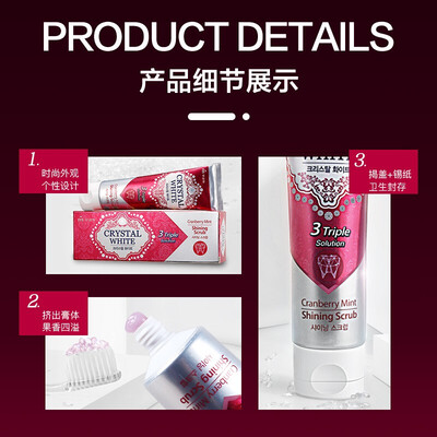 来自韩国进口的它,水晶蔓越莓薄荷口味,给你如同喝饮料一般的享受感。双效去牙渍,同时也可起到健齿的效果,同步焕亮。