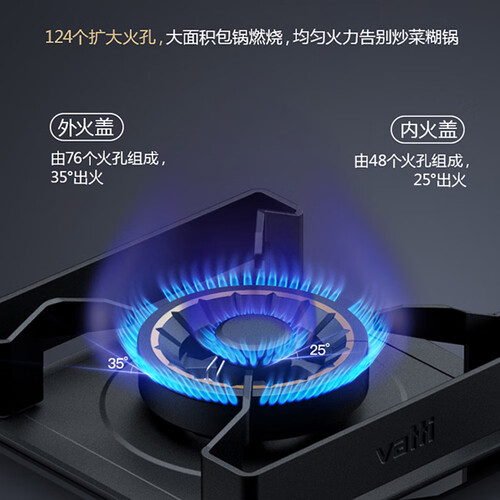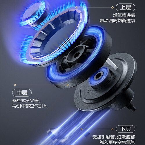 具有四通道提供氧气,让火力更猛烈,缩短食材的烹饪时间。外火盖带有76个出火孔,更为均匀,食材彻底都熟透。