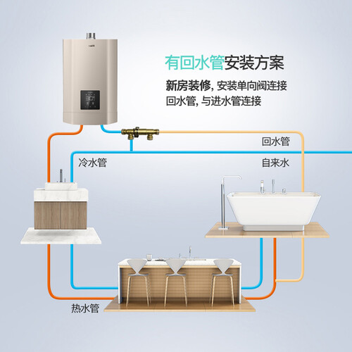 内置电辅加热模块,当水温过低时,自动启动加热保护,防止水系统冻裂。直流变频水泵,用前循环加热冷水,打开龙头即有热水。
