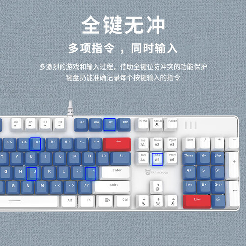 金属面板,耐摔耐用。采用全键无冲技术,响应快速,告别误触困扰。根据人体工程学设计的按键弧度,顺应自然的打字姿势。