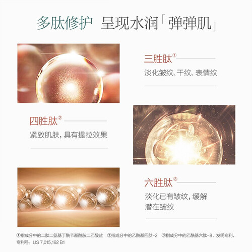 富含六胜肽成分,淡化面部细纹,建立肌肤屏障,抵御外界对肌肤伤害,赋予肌肤活力,焕亮肌肤。