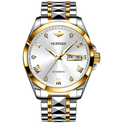 此款手表采用经典的大三针设计,沉稳大气,轻松驾驭不同商务场合;搭配双日历窗口,美观实用,便于进行时间管理。
