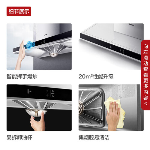 烟机可挥手智控,瞬间大吸力。一体成型油网,避免藏污纳垢。灶具的自适应底盘,改装不改孔,灵活安装。熄火保护,守护烹饪安全。