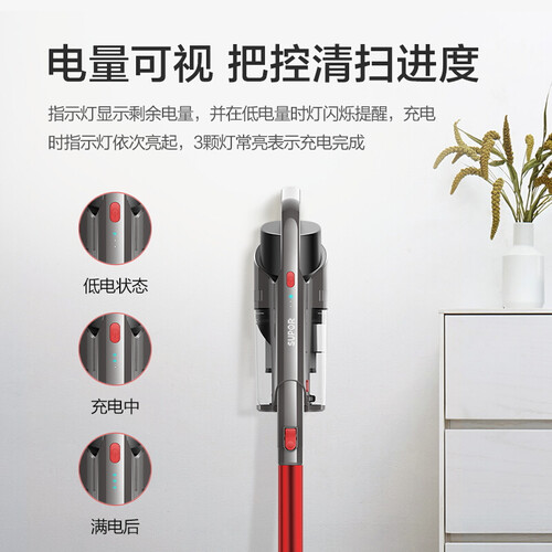 设有智能指示灯,电量不足时会自动亮起,提醒用户及时充电。配有软毛电动地刷,能紧贴墙角进行吸尘,清理干净不留灰。