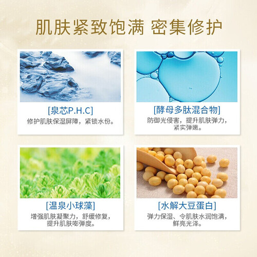 含酵母多肽混合物,结合紧致弹润科技,能唤醒肌底胶原活力。并可帮助受损初老肌恢复凝聚力,同时舒展皱纹,打造丝缎般柔滑肌肤。