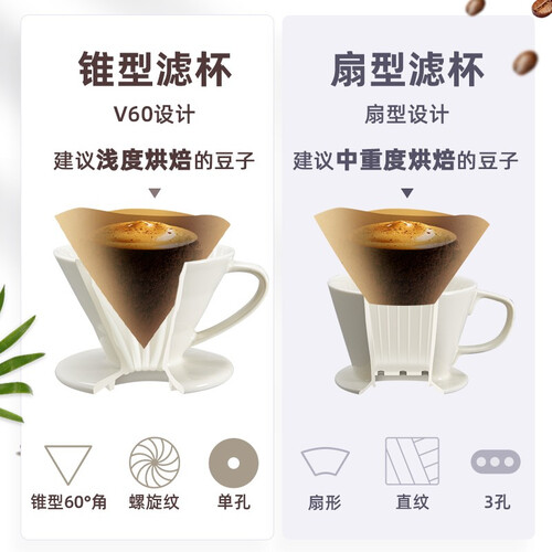 采用扇形滤杯,三孔设计,可充分浸泡咖啡,且水流比较稳定。陶瓷材质,萃取效率高,耳型把手,拿握舒适又防滑。