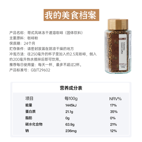 采用低温冻干技术,充分保留咖啡本身香气,纯黑咖,口感顺滑流畅,浓香纯粹,不含蔗糖,0脂低热量,助力健康塑形。
