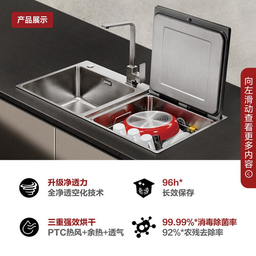 水槽嵌入式设计,无需后期留位,安装更简单方便,适应不同场景使用。多挡碗碟清洗模式,随心切换您需要的模式,操作简单。