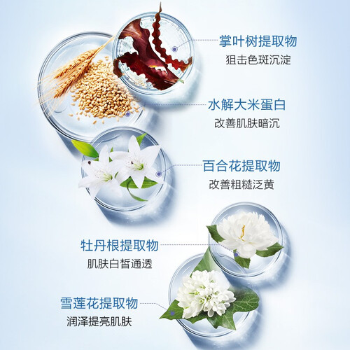 套装中含有烟酰胺、掌叶树、水解大米蛋白等美白成分,能深入肌底,抑制色素生成,改善肤色不均,养出透润光感肌。
