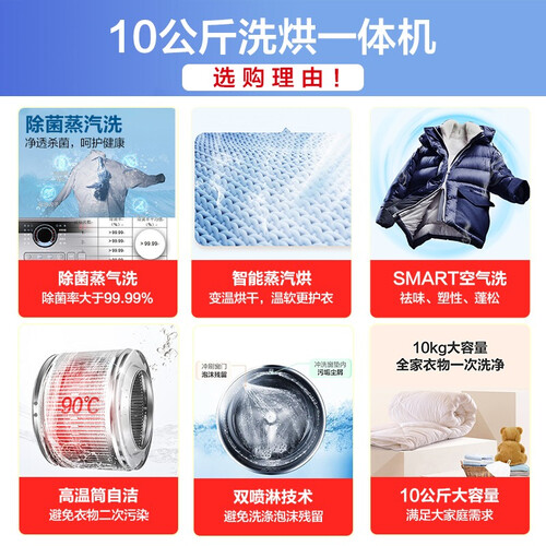 微蒸汽空气洗,高温除菌祛味,杀菌除螨。纤维级柔烘模式,轻柔洗烘,保护衣服不变形。高温筒自清洁,拒绝衣服二次污染。